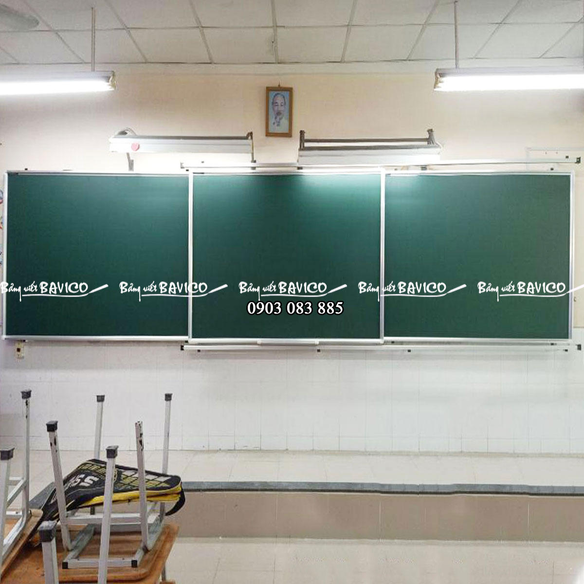 | MẶT BẢNG TRƯỢT NGANG THÔNG MINH Mặt bảng từ màu xanh nhập khẩu từ DongBu – Hàn Quốc. Qua 17 lớp sơn trên nền màu xanh chống loá, chống mài mòn, trơn trượt, dễ xoá. Mặt bảng dày 3 dem. Với nét kẻ ô ly chìm 5 cm sẽ không bị mài mòn theo thời gian. Mặt bảng dễ viết, dễ xoá, có từ tính cực mạnh. | ![]() |